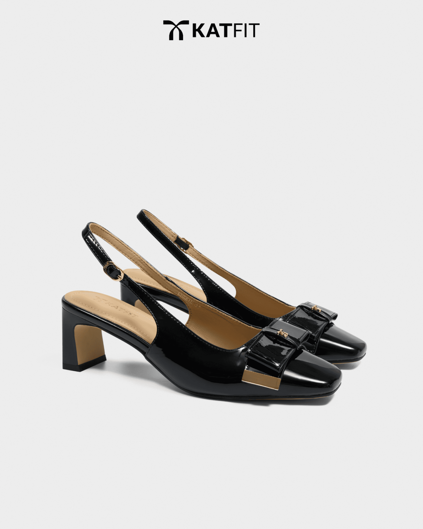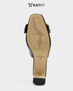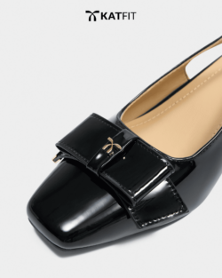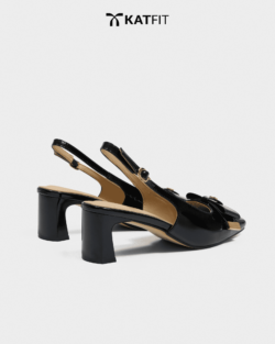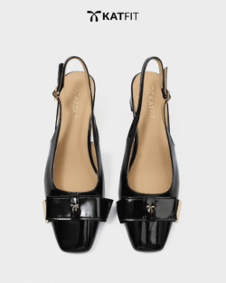 Quai slingback có khóa điều chỉnh, nơ da patent bản lớn, charm logo ánh kim, chi tiết viền kim loại ánh vàng
