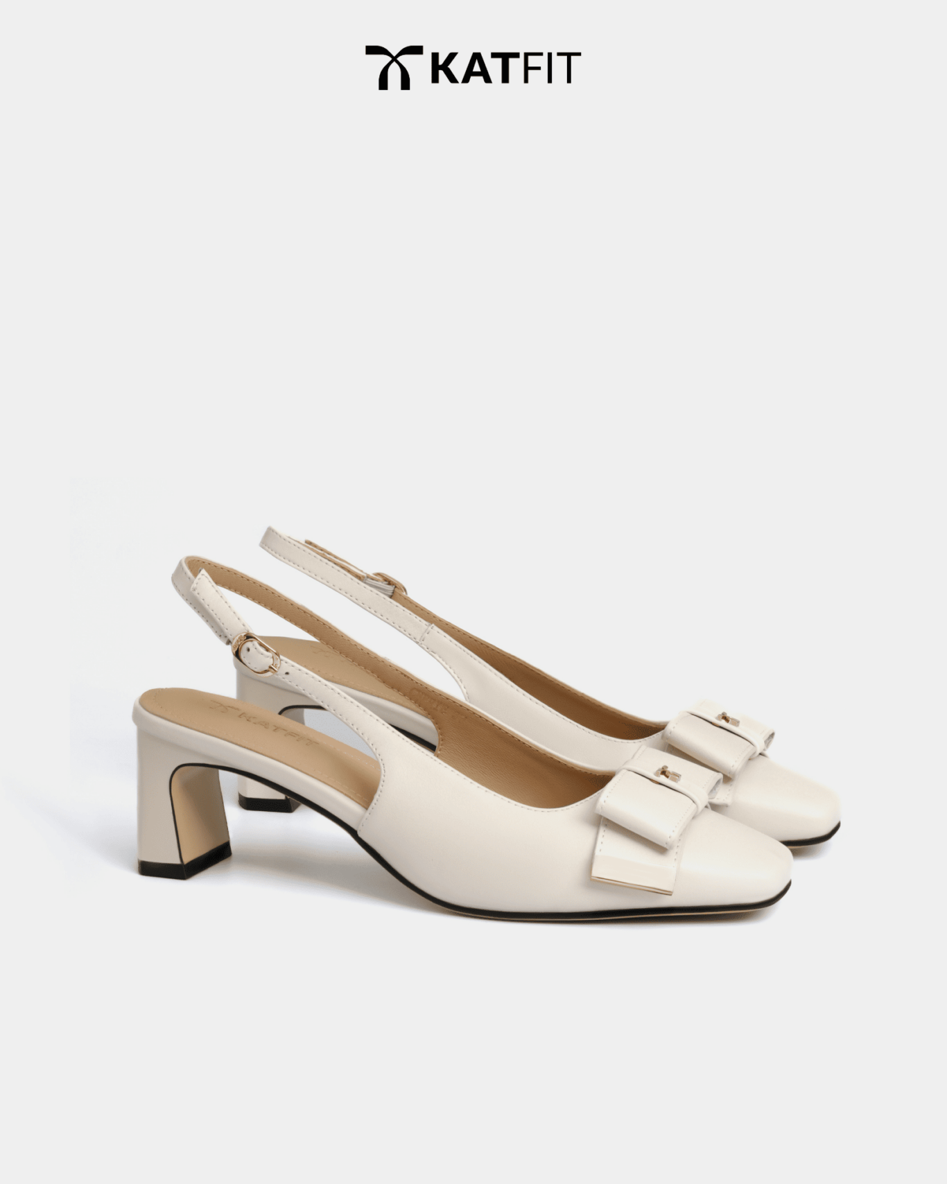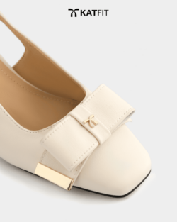 Quai slingback có khóa điều chỉnh, nơ da patent bản lớn, charm logo ánh kim, chi tiết viền kim loại ánh vàng